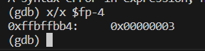 첫 st 명령어가 실행된 직후, %fp-4 위치의 값을 찍어보면 이렇게 0x00000003 비트가 찍혀서 저장되어 있음을 알 수 있다.