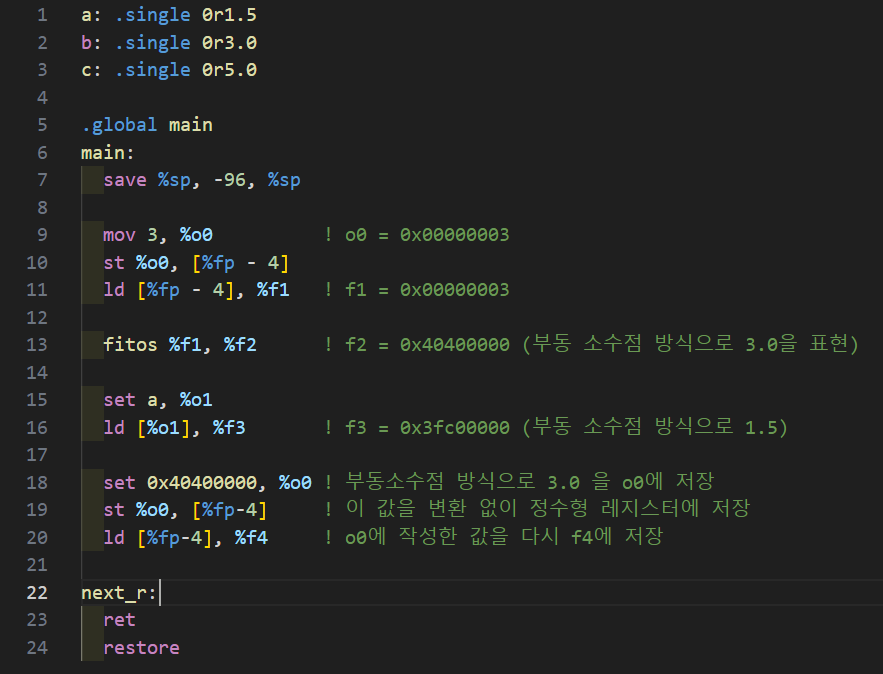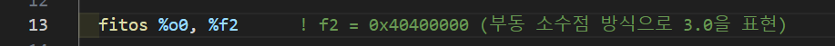 마지막으로 3.0의 부동소수점 표현을 %o0에 저장한 뒤, 이를 메모리를 거쳐 f4에 저장하면