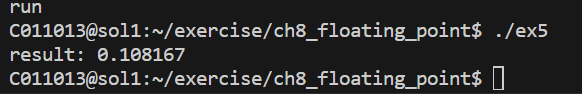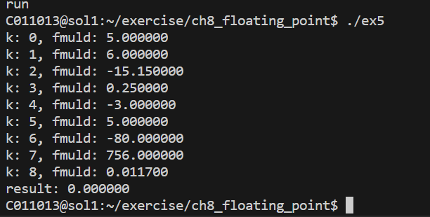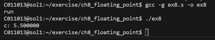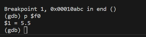 gdb로 찍어보니 gdb는 단정밀도 기준으로 계산해서 보여주는 것 같았고, printf 를 해보니 잘 되었는데, 이상하게 printf 함수를 호출하고나면 f 레지스터의 값이 이상하게 바뀌는 건지 printf 함수 호출을 중간에 넣는지 안 넣는지 차이만으로 실행결과 값이 바뀌면서 이상한 상황이 펼쳐졌다.