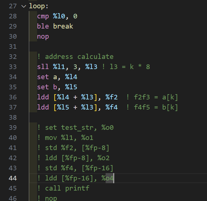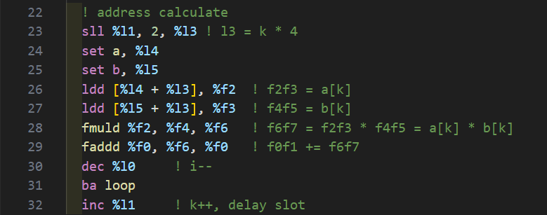 fmuld %f2, %f4, %f6 ! f6f7 = f2f3 * f4f5 = a[k] * b[k]