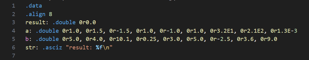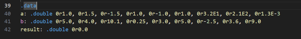 a: .double 0r1.0, 0r1.5, 0r-1.5, 0r1.0, 0r-1.0, 0r1.0, 0r3.2E1, 0r2.1E2, 0r1.3E-3