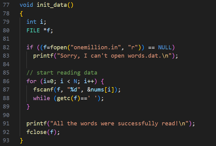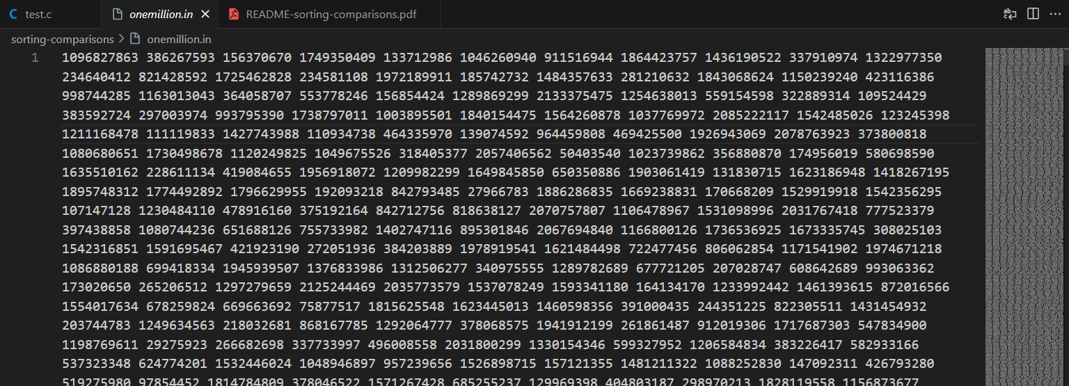 이를 위해 먼저 100만개의 정수가 담긴 데이터를 ' ' 기준으로 끊어 배열에 저장한다.