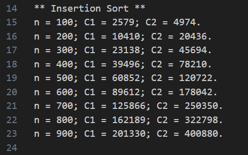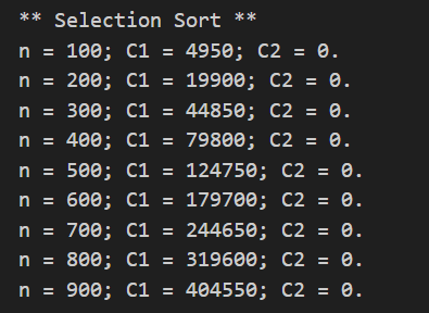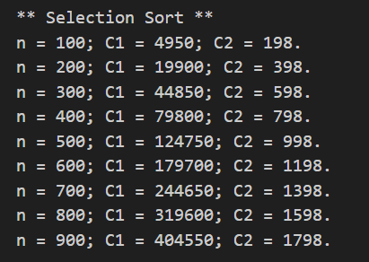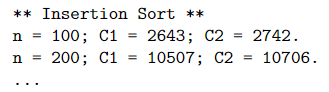 이때 그림과 같이 C1 = 키값 비교 횟수, C2 = 정렬을 위해 배열에 데이터를 쓰는 연산을 수행한 횟수를 세었다.