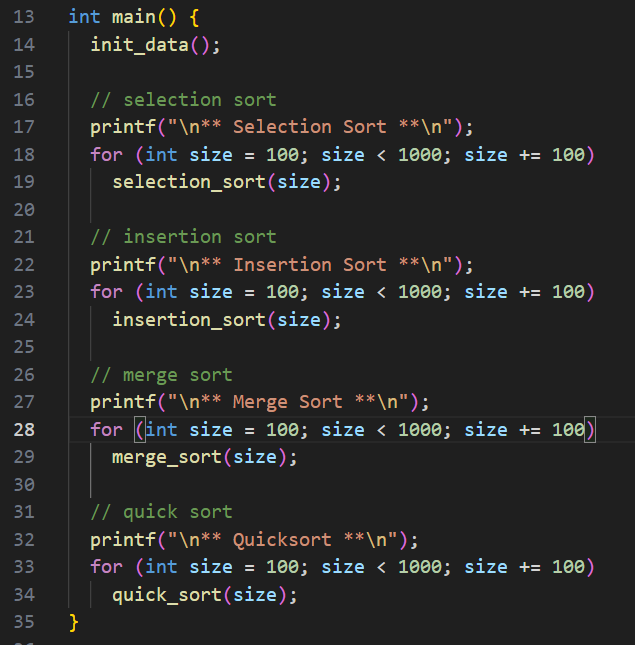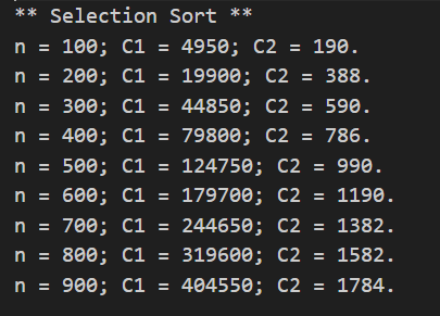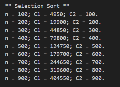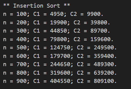 정렬은 사이즈가 100, 200, 300, ..., 900 인 상황을 매번 수행해보면서, 그 때의 비교횟수와 데이터 쓰기 횟수를 카운팅한다.