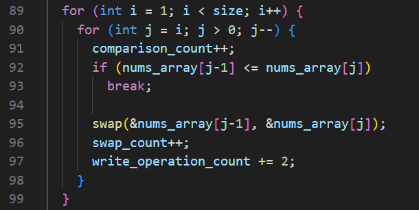 배열에서는 중간에 insert 하는 작업을 수행하려면 그 뒤의 원소를 모두 한칸 뒤로 밀어야 하기 때문에 이를 구현하기 위해 자신의 바로 왼쪽 값이 자신보다 크다면 swap 하는 과정을 반복하는 것으로 구현한다.