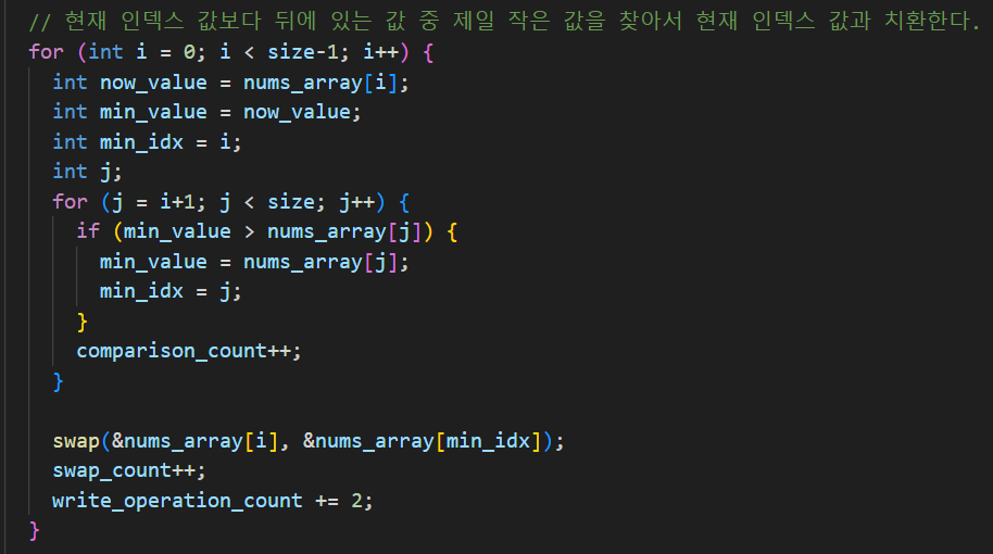제일 작은 값의 인덱스를 구한 이후 swap 을 수행하면 swap_count가 1 증가한다.