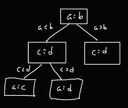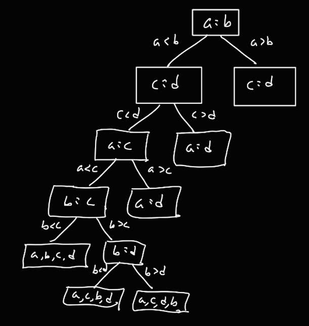 공간상 여유가 없어 나머지 부분은 그리지 않았지만, 이런 comparison tree 는 정렬 방법과, 초기 input 데이터가 주어졌다면, 그 정렬 방법에 따라 tree 를 그릴 수 있다.