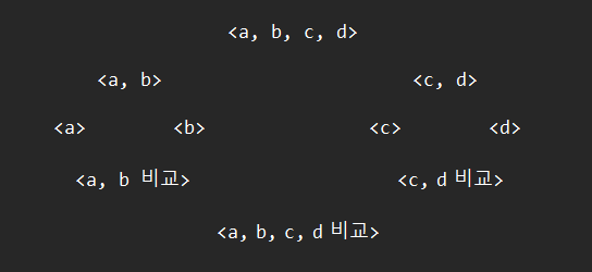 a, b, c, d 라는 4개의 데이터에 대해 merge sort 를 수행하면, 반씩 쪼개다가 merge 하는 과정에서 비교를 수행한다.