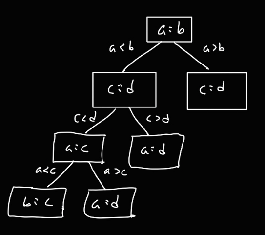 c, d 의 비교 결과 정렬이 되면, < a, b, c, d > 4개를 정렬할 차례가 온다.