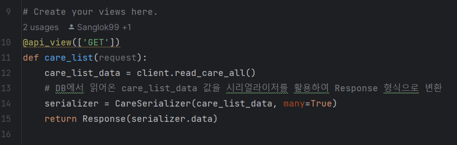 care 라고 하는 앱을 새로 만들어 뷰 함수를 작성하였다.