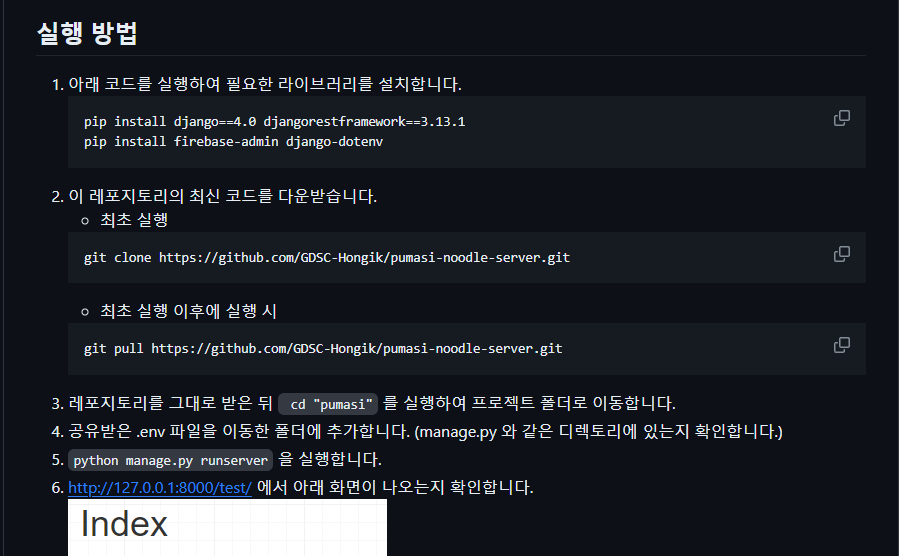 그래서 어떤 과정으로 개발환경을 세팅해야 하는지 아랠와 같이 리드미를 자세히 작성하였다.