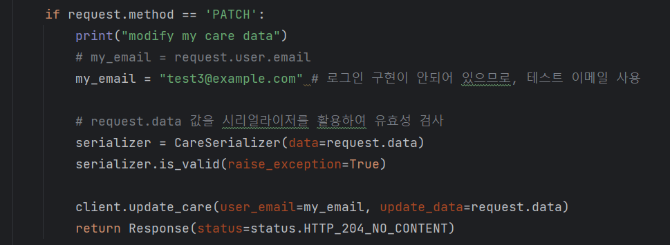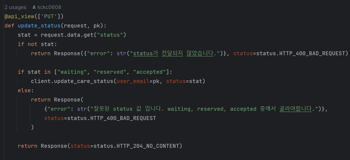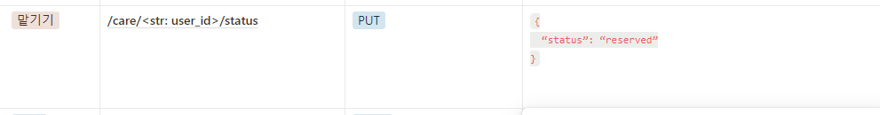 그런데 현재 '맡기 데이터를 수정' 하는 API는 맡기 데이터를 생성한 사용자가, 이를 수정하려고 할 때 사용하는 API 로 의도를 잡았다. 그래서 이 상태를 변경하고자 할 때 PATCH /care 를 사용하는 것은 옳지 않다고 생각하여 1월 15일 회의를 진행한 뒤 status 변경을 위한 별도 API를 만들었다.