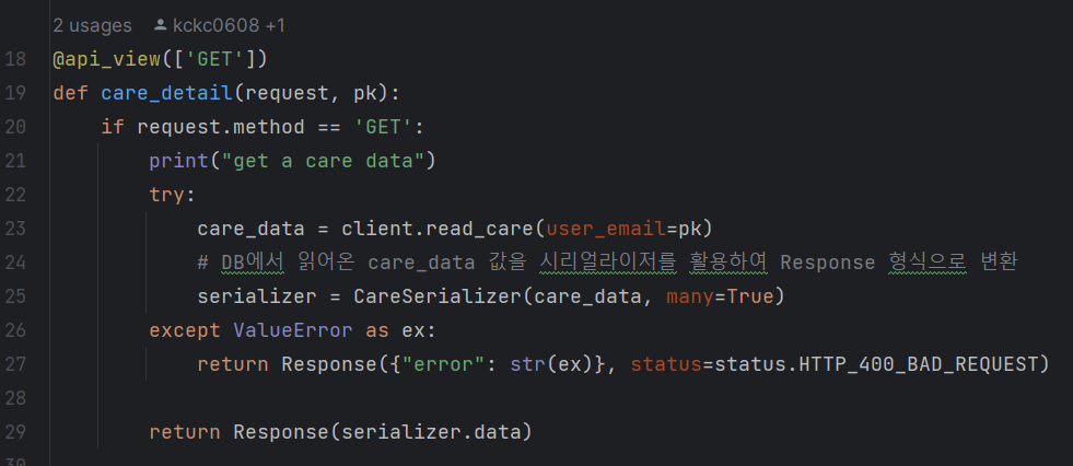 나는 DB에서 데이터를 가져오는 코드를 작성하였고, 다른 백엔드 팀원은 가져온 데이터를 응답 형태에 맞게 바꾸는 시리얼라이저 코드를 작성하였다.