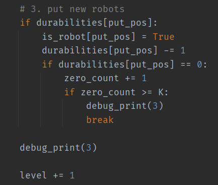 => 순회하는 시점에 로봇이 내리는 위치에 있었다면 이동을 시켜도 안되고, 내구도도 감소시키면 안되지 않나요?