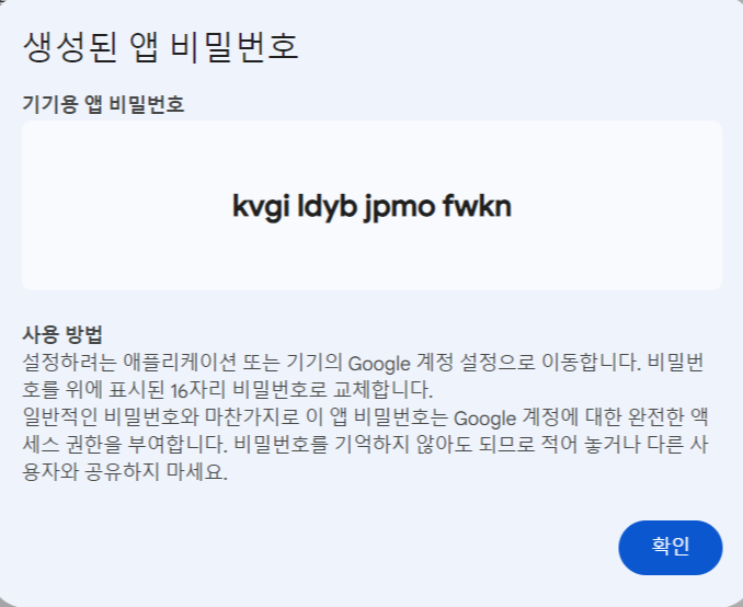 앱 이름을 자유롭게 자신이 확인하기 좋은 이름을 지어주고, 만들기 버튼을 클릭하면 앱 전용 비밀번호가 생성된다.