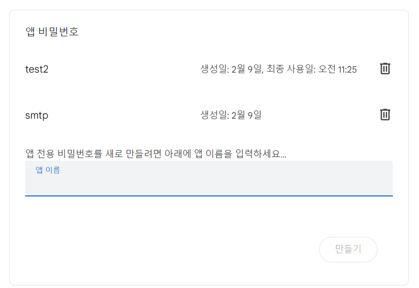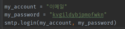 이제 smtp 라이브러리에서 계정에 로그인할 때, 계정 비밀번호 대신, 발급받은 앱 비밀번호를 사용하면 된다.