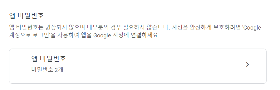 오른쪽 화살표를 클릭하여 상세 페이지로 이동한 후, 화면을 밑으로 내려주면 아래와 같은 앱 비밀번호 설정 메뉴가 있다.