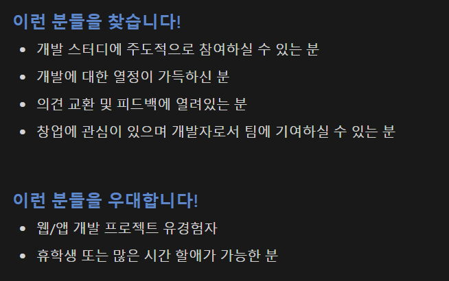 나는 백엔드로 지원하였고, 위 사진은 '개발' 파트 모집 공고에 올라온 내용이다.