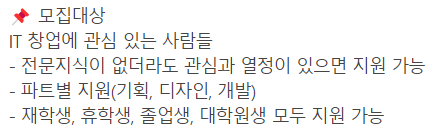 모집 대상은 '창업' 에 관심있는 사람이라고 했는데, 면접 파트에서 후술하겠지만 나의 경우 창업 질문은 나오지 않았다.