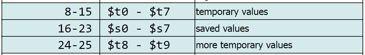 설명에 나와있는 것처럼 MIPS는 10개의 temporary value 용 레지스터 공간과, 8개의 saved value 용 레지스터 공간을 제공한다.