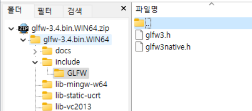 여기에서 glfw3.lib 파일만 가져와 사용하면 된다.