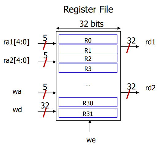 ra1, ra2, wa 포트가 5bit 인 이유는, 레지스터가 0부터 31까지 총 32 = 2^5 개가 있기 때문이다.