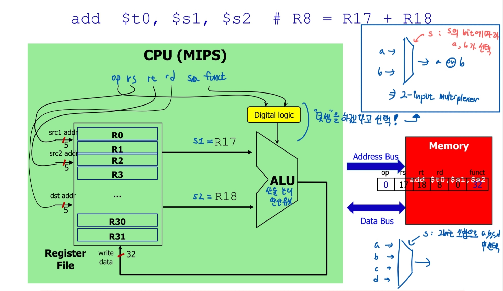 op, funct 코드는 2-input mux (multiplexer) 에 들어가 어떤 명령어를 실행할 지 선택한 뒤 ALU에 선택 결과를 보낸다.
