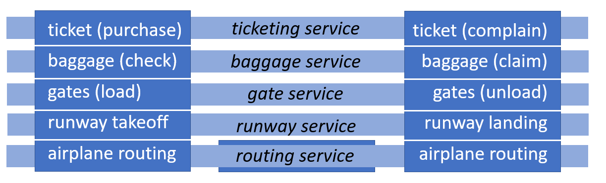 이렇게 비행기로 이동한다는 하나의 큰 서비스를 작은 세부 단계로 나눠 계층화 시켜두면 큰 서비스를 유지보수하기가 쉽다는 장점이 있다.