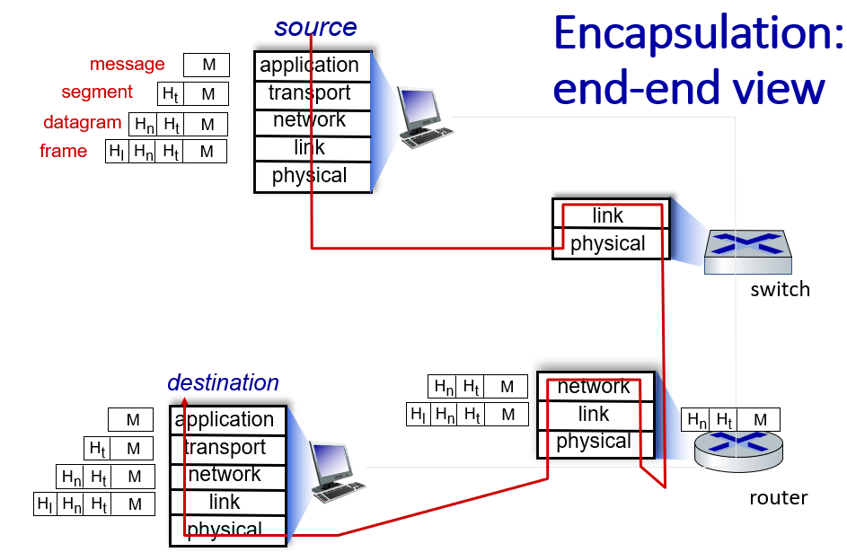 스위치는 주로 2계층에서 사용되므로 2계층 정보까지만 받아 처리하고, 다시 2계층에서부터 데이터를 캡슐화해 라우터로 보내고, 라우터는 3계층까지만 데이터를 읽은 뒤, 목적지 컴퓨터를 결정하면 새로 3계층부터 캡슐화해서 최종 목적지 컴퓨터로 데이터를 보낸다.