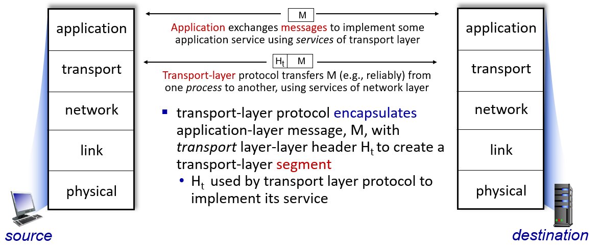 트랜스포트 계층으로 넘어오면 message 를 캡슐화 한 뒤, 그 위에 트랜스포트 계층에서 필요한 제어 정보(헤더)를 붙인 뒤 새로 캡슐화한다. 이렇게 만든 트랜스포트 계층의 데이터 단위가 '세그먼트' 이다.
