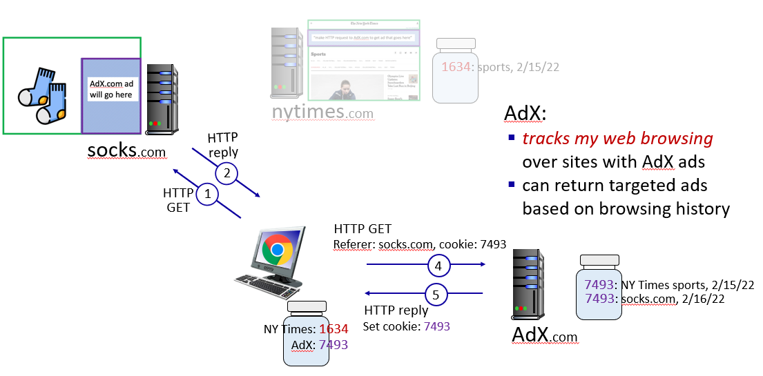 그러면 이때도 브라우저는 자연스럽게 Socks.com 으로 HTTP 요청을 보낼 뿐 아니라 AdX.com으로도 요청을 보내게 되고, 이때 AdX.com 은 한번 방문했던 사용자가 또 자신에게 광고 데이터를 요청했음을 알 수 있게 된다.