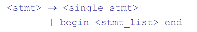 begin 과 end 라는 키워드 (렉시컬 토큰, 터미널) 사이에 있는 stmt_list 라는 논 터미널로 확장될 수 있다는 의미를 나타낸다.