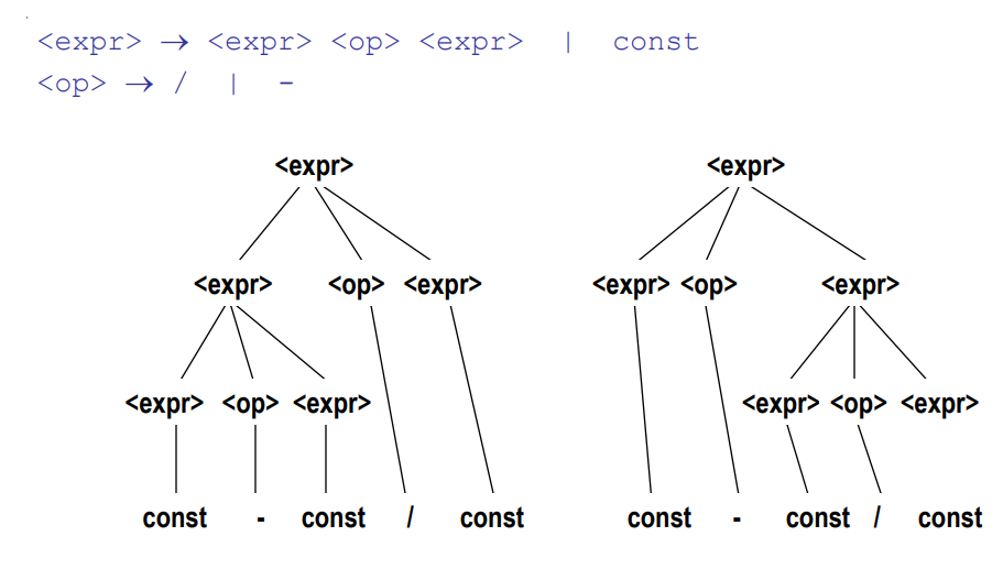위 수식은 const + const + const 라는 식에 대해 파싱트리를 만들 때 2가지 파싱트리가 나올 수 있다.