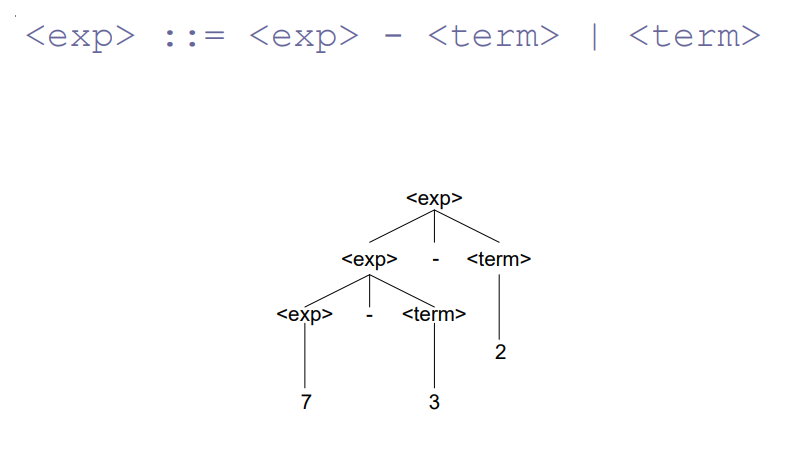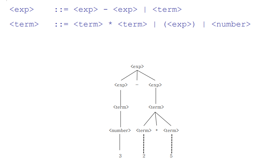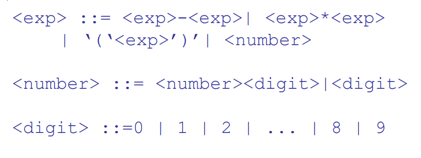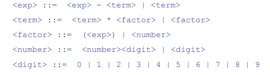 이 예제를 보면, expression 은 exp - exp 또는 exp * exp 또는 (exp) 또는 number 로 확장된다.