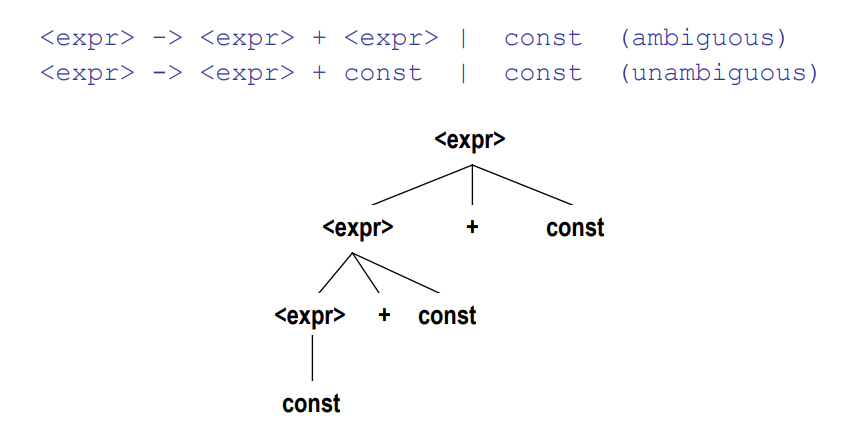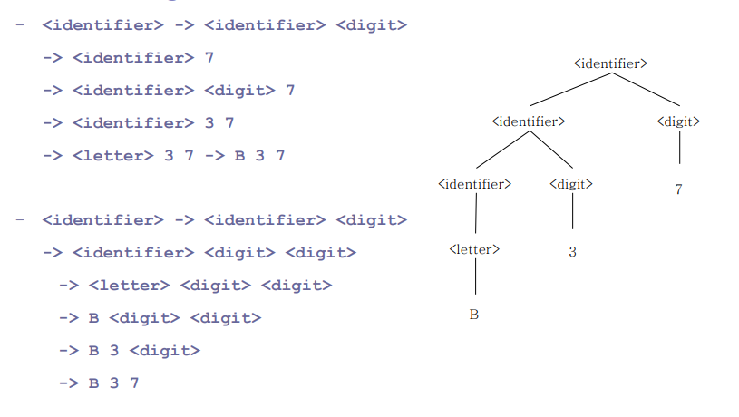 BNF를 통해 문장을 전개하는 과정에서 어떻게 전개하는지에 따라 서로 다른 결과가 나올 때가 있다.