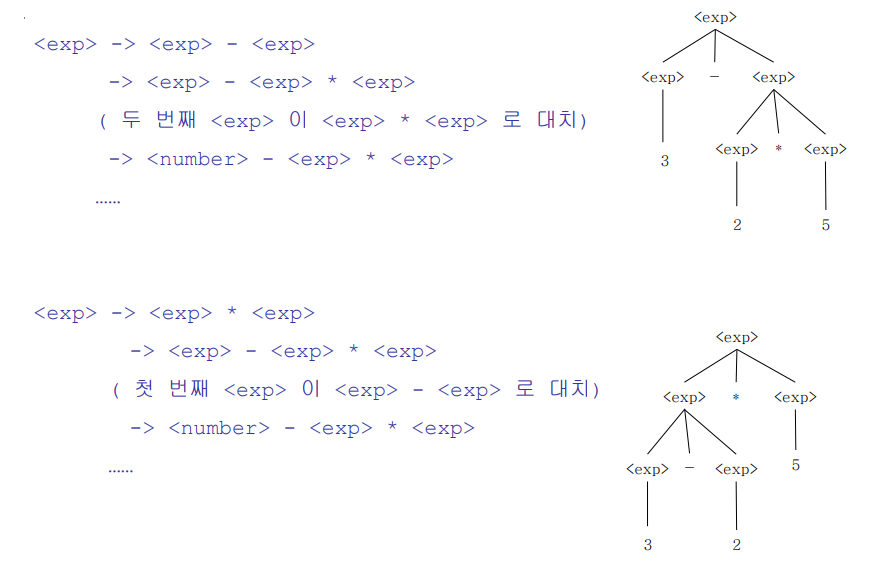 이 문법을 3 - 2 * 5 라는 표현식에 적용하면 위와 같이 2가지 파싱트리가 나온다.