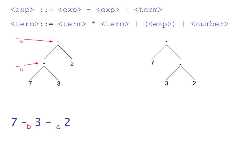 그래서 사진과 같이 뺄셈이 연속해서 나올 경우 2가지 파싱트리가 나온다.