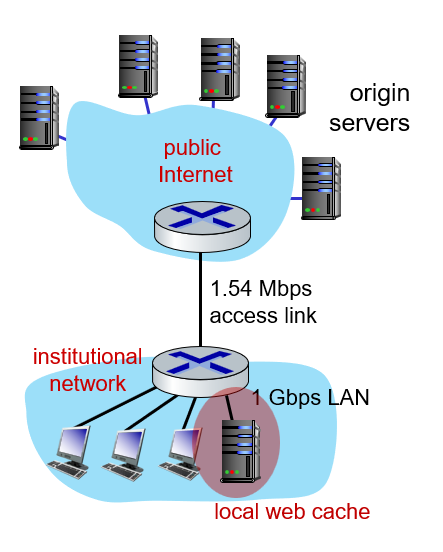 이렇게 구성하면 클라이언트 요청에 대한 response time 을 줄일 수 있고, origin server 로 가는 링크들의 트래픽을 줄이는 효과도 있다. 그리고 이렇게 웹 캐시가 클라이언트의 요청을 오리진 서버 앞에서 미리 받기 때문에 '프록시 서버' 라고도 한다.