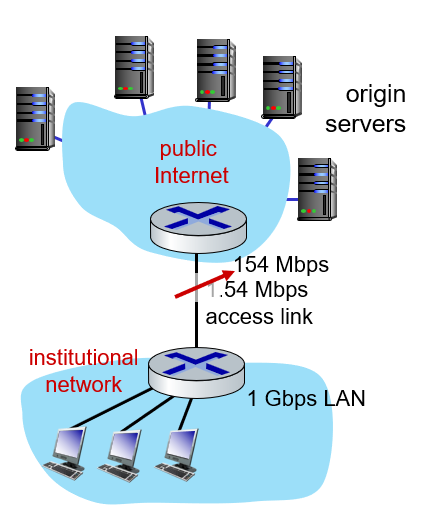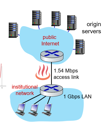 (2초는 institutional router 에서 origin servers 로부터 데이터를 얻어오는 시간, minutes 엑세스 링크가 가득차서 그 링크를 통과하기까지 기다려야하는 queueing delay를 의미한다. usec는 institution router 에 연결된 클라이언트와 라우터 사이 데이터 통신 delay 이다.)