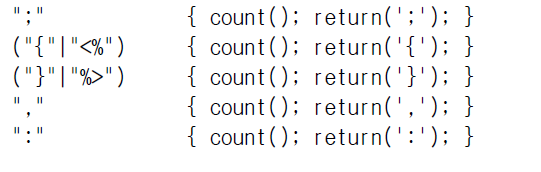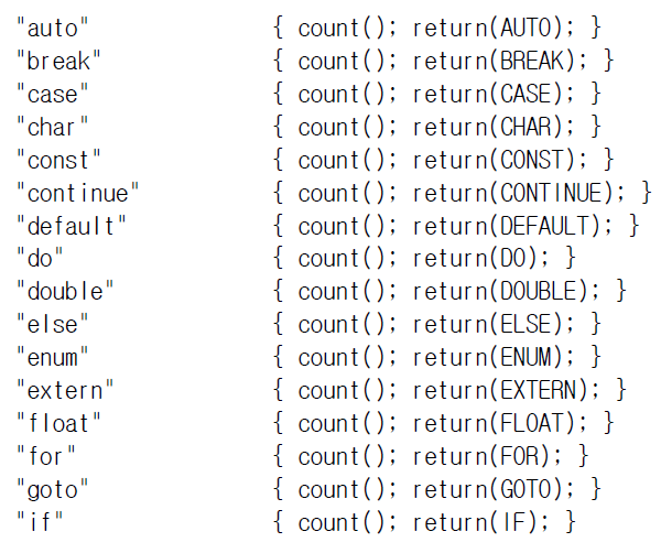 이외에도 각종 c언어 키워드들에 대해 이렇게 count 해서 개수를 센 뒤에 각 키워드를 대문자로 바꾼 lexical token 을 반환한다. (반환하는 대상은 당연히 파서다. 파서가 이 lexical analyzer를 호출했을 것이기 때문이다.)