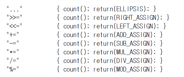 이외에도 각종 c언어 키워드들에 대해 이렇게 count 해서 개수를 센 뒤에 각 키워드를 대문자로 바꾼 lexical token 을 반환한다. (반환하는 대상은 당연히 파서다. 파서가 이 lexical analyzer를 호출했을 것이기 때문이다.)