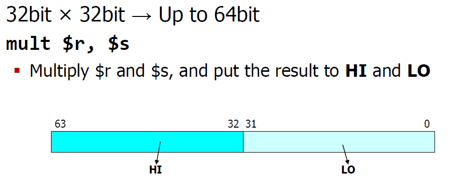 mult 는 r, s 레지스터의 값을 곱한다. 결과는 hi, low 라는 별도 공간에 따로 저장된다.
