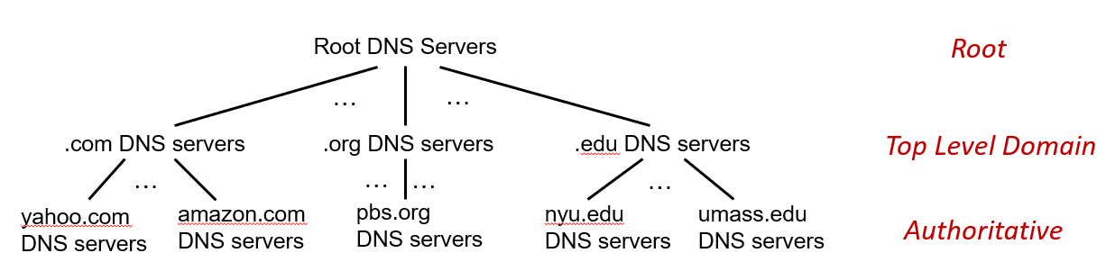 따라서 DNS는 계층구조를 가지되, 하나의 중앙화된 DNS 서버를 갖고 있지는 않다.