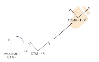 복합 변환 행렬을 I 라고 하는 기존 좌표계 (단위 행렬) 에 변환을 오른쪽으로 곱해 최종 CTM 을 만든다.