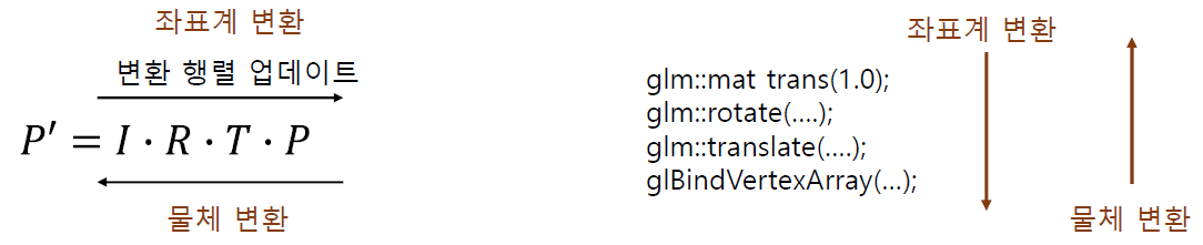 오른쪽은 일단 좌표계를 옮겨놔야되니 기존 좌표계(단위행렬) 오른쪽에 변환행렬을 곱한 뒤, 정점을 곱하는 방식이다.