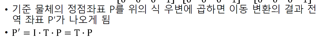 정점을 변환할 때는 이 행렬 오른쪽에 변환하려는 모델좌표계 위의 점을 곱하면 된다.