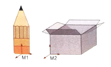 연필과 상자를 전역 좌표계 (World Coordinate System, WCS) 에 배치하기 전에 연필과 상자를 구성하는 정점은 각각 M1, M2 라는 자신들만의 좌표계 방식으로 표현한다.