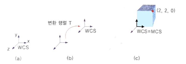 모델좌표계 기준으로 표현된 정육면체 정점을 월드에 그리기 위해, WCS 좌표계를 변환행렬 T 를 이용해 MCS 위치로 옮긴다. 이후 이를 기준으로 정육면체를 그린다.