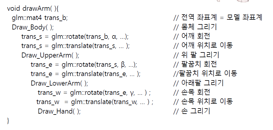 인체 또는 로봇팔과 같은 다관절 객체를 그릴 때는 계층구조를 설정하는 것이 좋다.