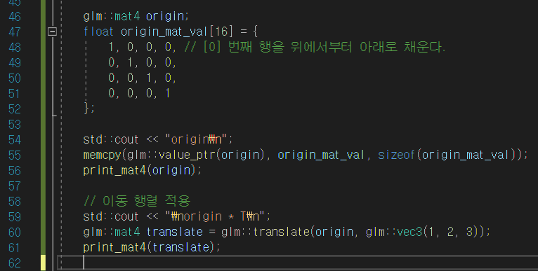 이렇게 단위행렬을 입력으로 주고, 이동 변환을 적용해보았다.